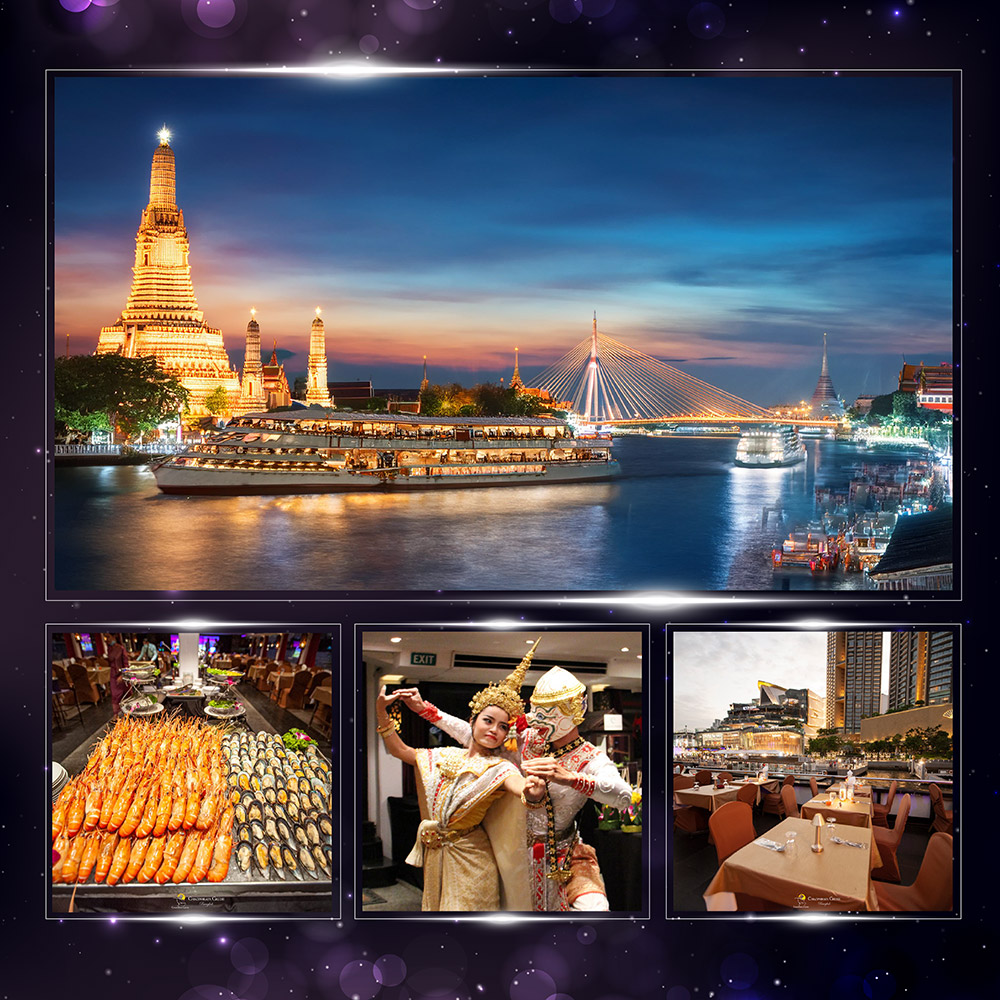 Board the ship at Asiatique. Enjoy a delicious Thai and international buffet on a large cruise ship. Enjoy Thai cultural performances, soft live music. Enjoy visiting popular tourist attractions and temples along the Chao Phraya River at night, decorated with beautiful lights.